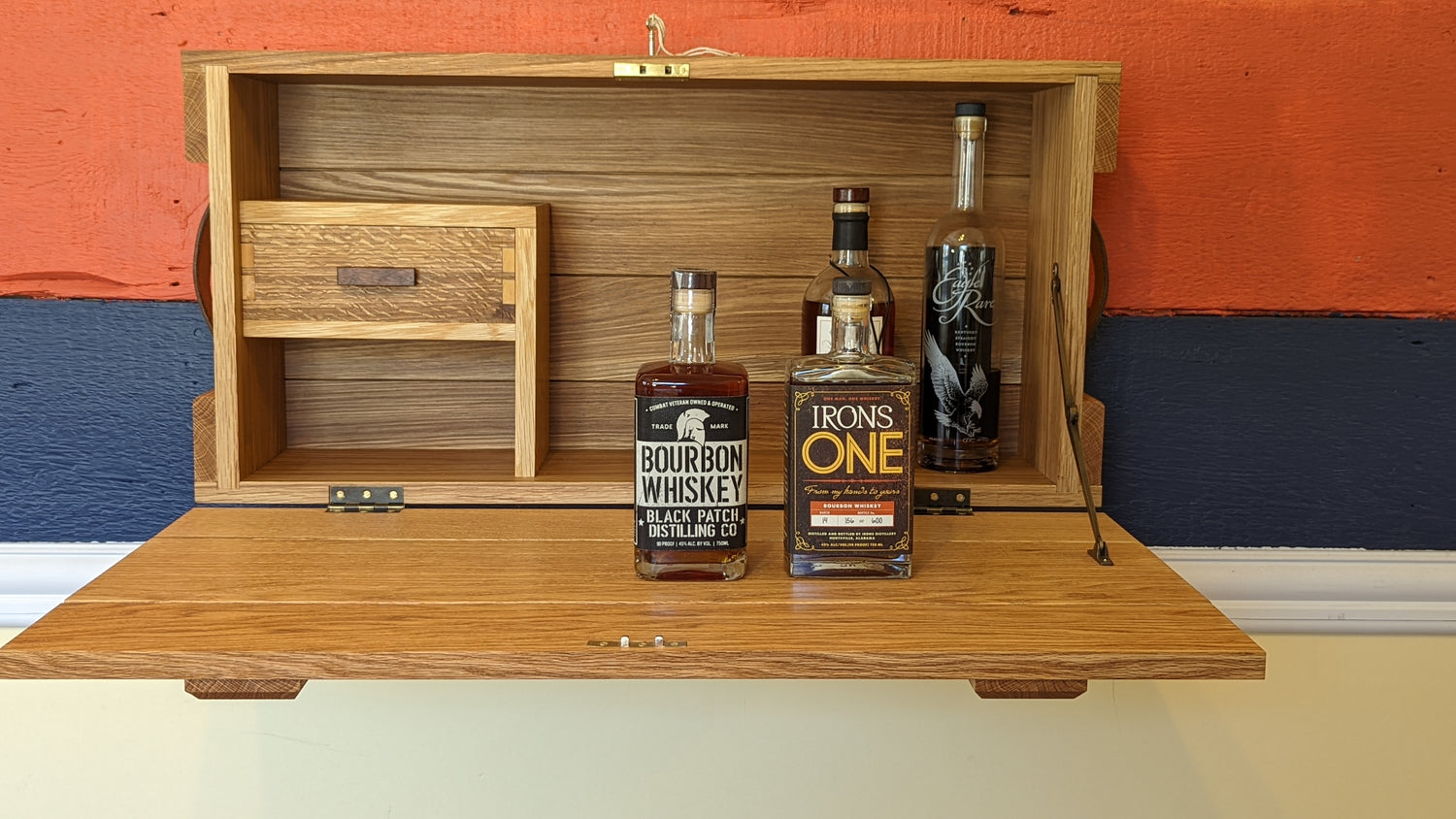 Inspired by a military ammo crate, this bourbon cabinet is handcrafted to store your best bottles. The size is 31in x 15in x 7in and will hang on any wall. It will allow for approximately 4-6 bottles and 4 glass to be stored. Additionally, the drawer is crafted with hand cut dovetails and allows for small storage of all your mixing utensils.