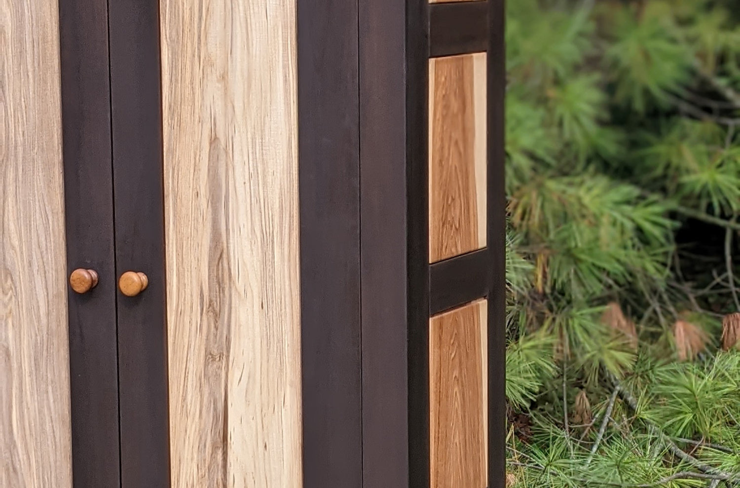 A classic design that highlights the combination of grain and color. This cabinet offers massive amounts of storage while making a statement. The unique grain patterns of the hickory and hackberry panels are combined with the painted frame. This piece can be customized with almost any color and grain combination.