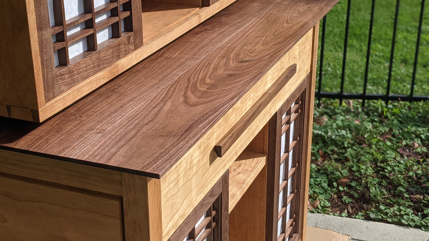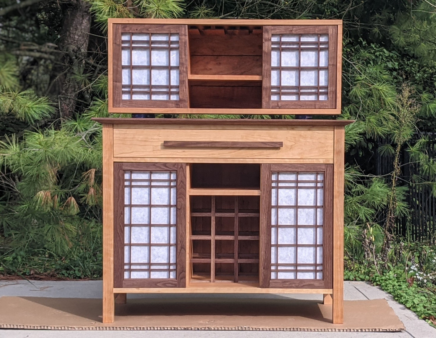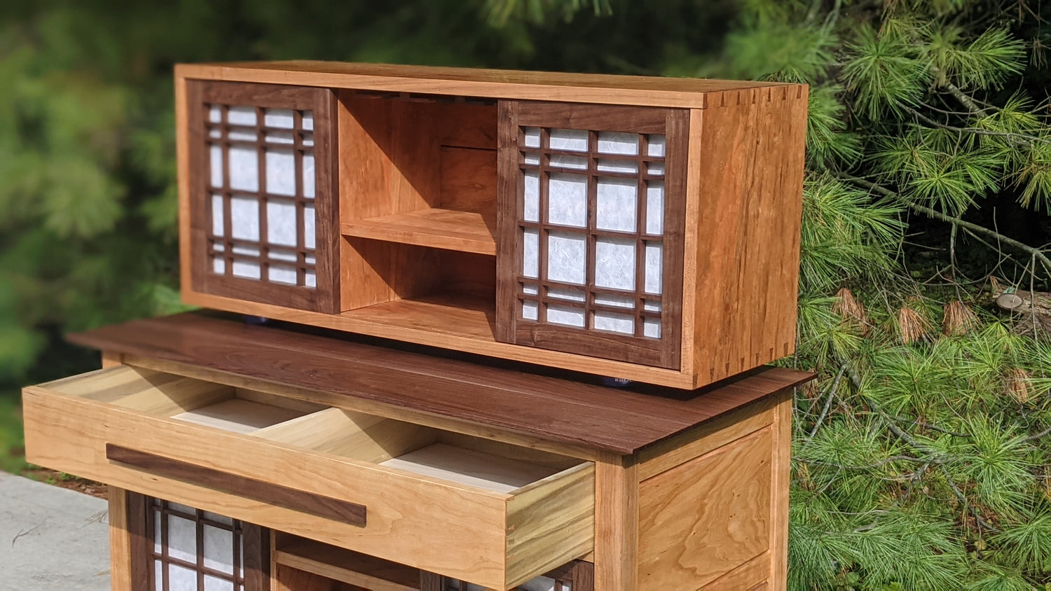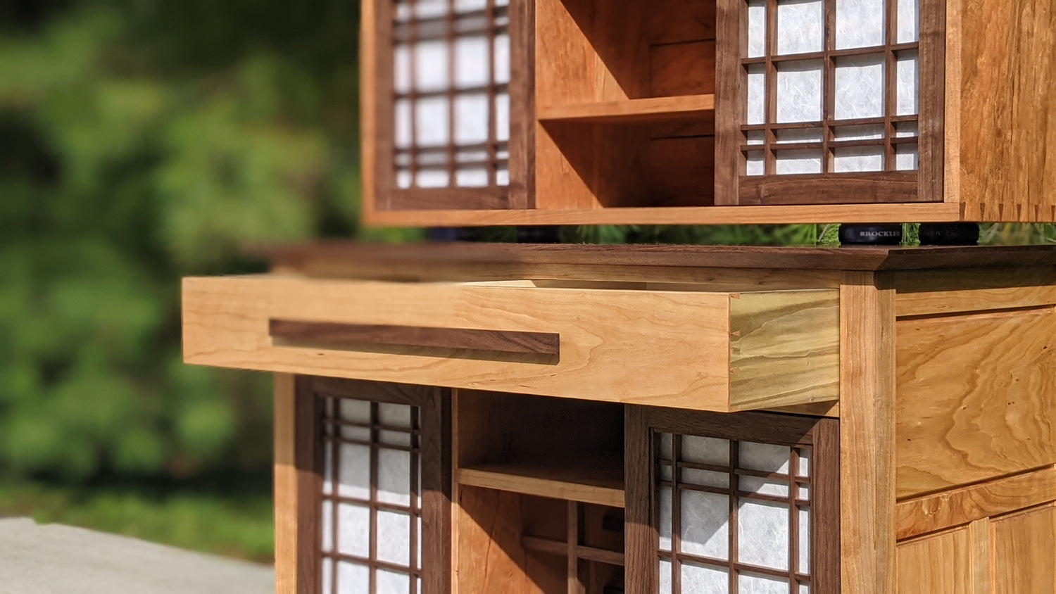 This piece is inspired by the combination of clean lines, joinery, and Japanese Kumiko styling. Additionally, the combination of Walnut and Cherry add a distinctive style.